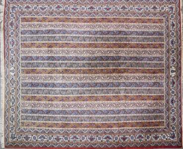 A décor de frises de boteh bleu, orange et rose, bordures à moti...