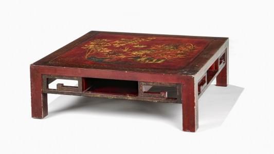 Bois laqué rouge et or à décor de volatiles, 34x90x90 cm