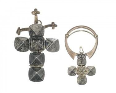 207. Epingle formant une croix ciselée sertie de verre sur paillon ve...
