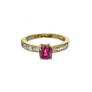 250. Bague sertie d'un rubis taille ovale (env. 0.8 ct) épaulé de deu...