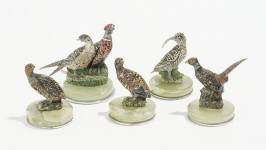 378. Cinq porte-menus ornés de faisans et bécasses
