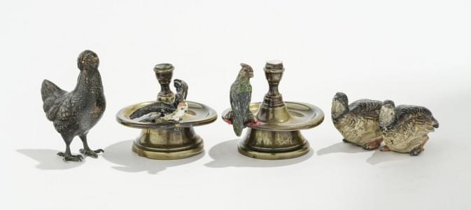 379. Poule, deux cailles et paire de chandeliers accueillant l'un un...