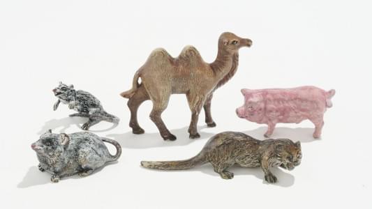380. Ensemble de cinq figurines: chameau, loutre, cochon, rat des vil...