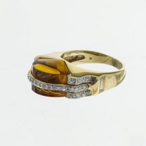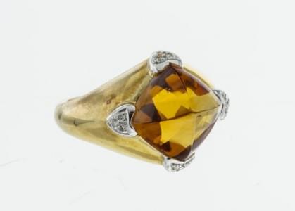 3116. Bague sertie d'une citrine en pain de sucre retenue par quatre m...
