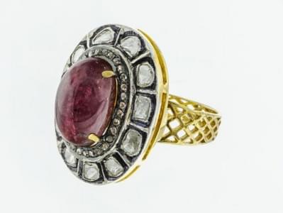 3141. Bague sertie d'une tourmaline en cabochon entourée de diamants e...