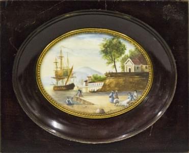 3153. Porte-cartes viennois à décor d'une femme sur un bateau