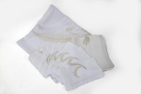 Nappe et 12 serviettes blanches brodées de palmes dorées