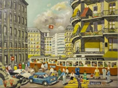 Bel-Air, Genève, huile sur pavatex, signée et datée 1976, 45x60...