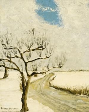 Route enneigée, huile sur carton, signée et datée, 48x38 cm