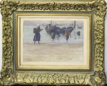 Bâteaux et personnages sur la plage, huile sur carton, 20x30 cm