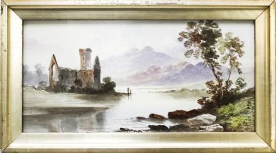 Figurant des paysages lacustres avec ruines, 15,5x30 cm