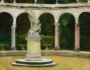 Cour avec statue à Versailles, huile sur pavatex, 22x28 cm