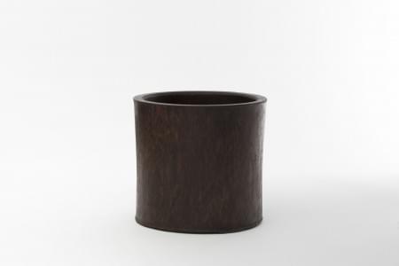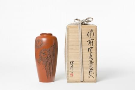 Grès couleur brique à décor incisé de fleurs, dans sa boîte d'or...