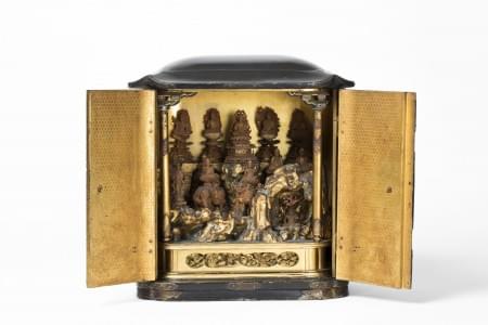 1054. Autel portatif (Butsudan) abritant une scène sculptée de bouddha...