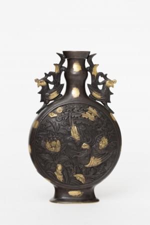 Bronze à patine brune, à décor d'oiseaux, H 44 cm