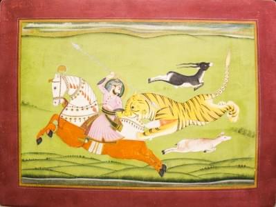 Scène de chasse au tigre, pigments sur papier, 35x48,5 cm