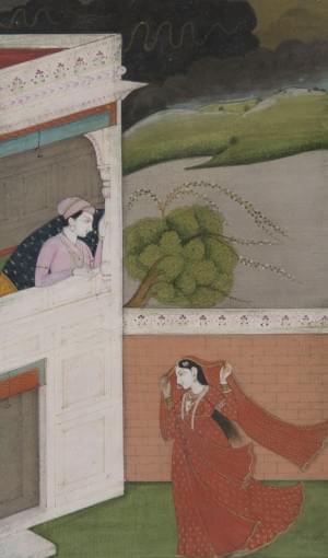 1091. Scène galante au pied d'un palais, école de Kangra ou Guler, Ind...