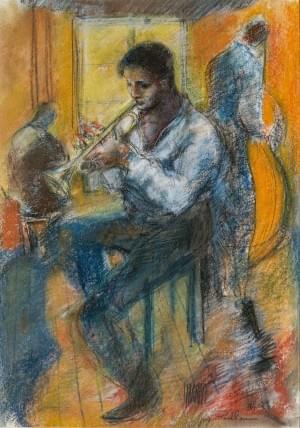 Trompettiste, 1994, crayon gras sur papier, signé et daté Yves P...