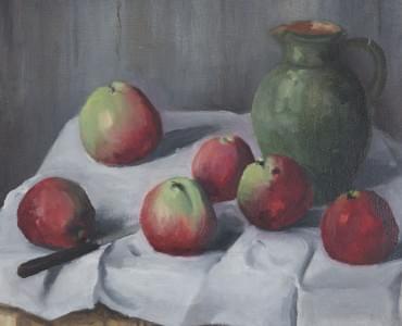 Nature morte aux pommes et au vase, huile sur toile marouflée su...
