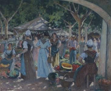 Scène de marché, huile sur toile, signée, 59x72 cm