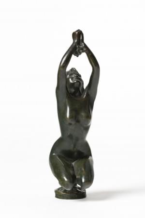 Femme nue les bras levés, bronze à patine verte, signé, H 22 cm