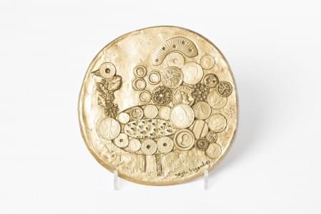 Poule aux œufs d'or, médaillon en bronze à patine dorée, signé,...