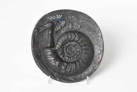 Coucou, médaillon en bronze à patine noire, perles et strass, D...
