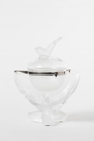 Verre moulé pressé et sablé à décor de rameaux et moineaux, H 17...