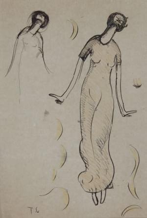 Figures stylisées de danseuses, encre sur papier, monogrammée, 3...