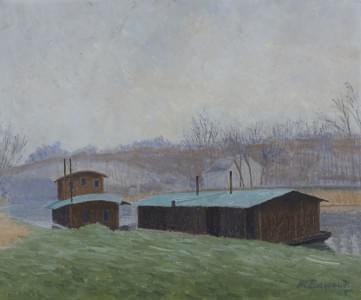 Péniche et lavoir sur le Loing, huile sur toile, datée, 59x71 cm