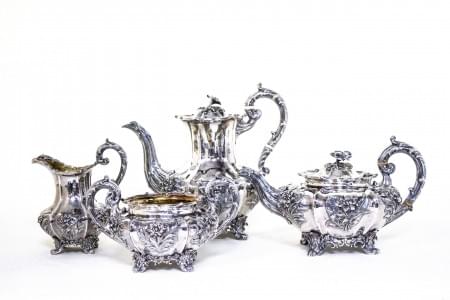 600. Service à thé d'époque George IV à décor repoussé et ciselé de f...