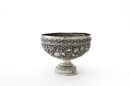 604. Coupe sur pied à décor repoussé de personnages et animaux,