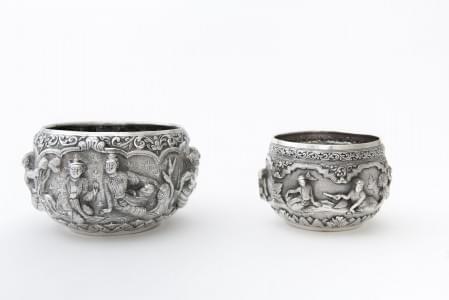 606. Deux bols à décor repoussé de scènes du ramayana et scène de cou...