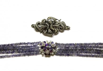 3115. Lot d'un collier tour de cou centré d'un motif de fleurs serties...