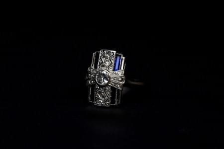 3159. Bague sertie d'un saphir taille ovale (env. 1 ct) épaulé d'un pa...