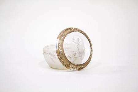 Verre moulé pressé et patiné à décor d'une danseuse, D 8,5 cm