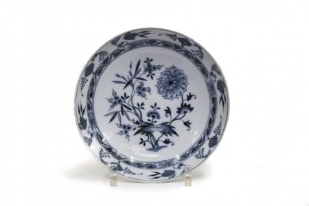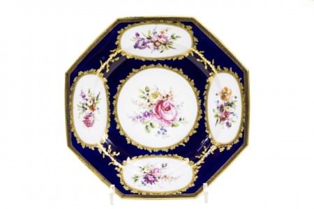 3269. Assiette octogonale bleu cobalt à décor de fleurs dans des médai...