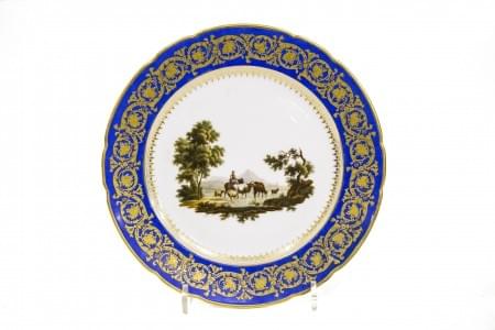 3268. Assiette à marli bleu nuit orné de rinceaux dorés et au centre d...