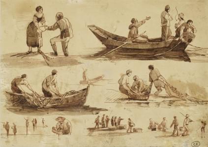 Etudes de barques animées, encre sur papier, ancienne collection...