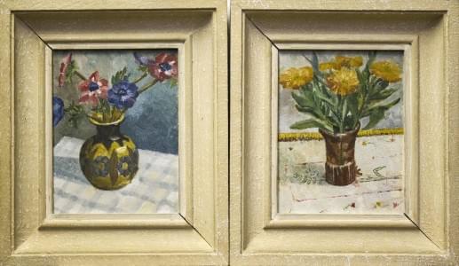 Paire de natures mortes, huiles sur carton, 34x34 cm