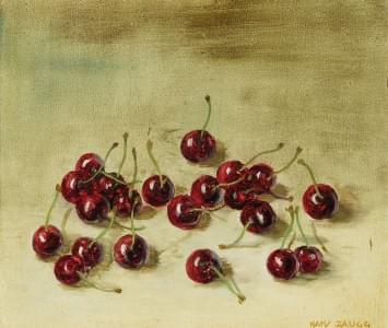 Cerises, huile sur pavatex, signée, 23x26 cm