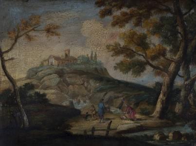 Paysage avec un cerf et un faucon, huile sur panneau, D 43 cm