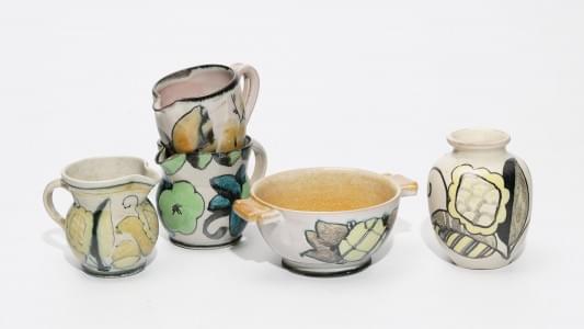 Trois pichets, un vase et un bol, céramique émaillée polychrome...