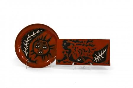 Assiette à motif soleil et palme noir sur fond rouge et plaque à...