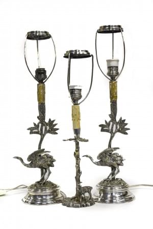 3873. Paire de lampes à motif d'échassier et une lampe assortie à moti...