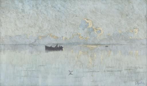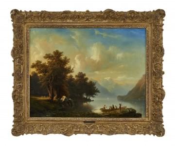 Lac de Brienz avec des personnages dans un ferry, huile sur toil...