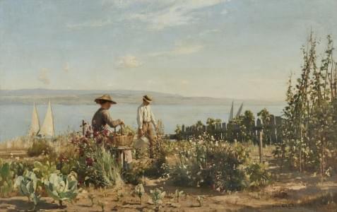 Au potager, huile sur toile, signée et datée 1885, 56x91 cm