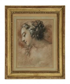 Jeune femme en buste, sanguine, fusain et craie blanche sur papi...