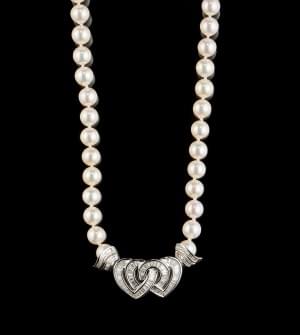 Composé de perles retenant un fermoir à motif de cœurs entrelacé...