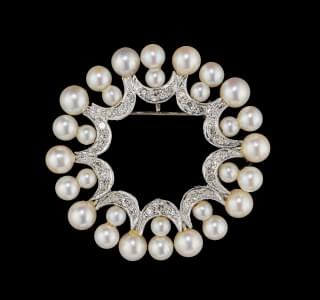 917. Broche ronde ajourée entourée de perles et sertie de diamants